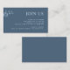 Elegante, azul contemporáneo "Join Us" tarjeta de gabinete de boda, con todas las secciones de texto abiertas a la personalización. Deje el título como "ÚNANSE A NOSOTROS" o cámbielo por "RECEPCIÓN", "TIEMPO" u otro. Diseño en un fondo azul oscuro con texto azul claro en una tipografía moderna y elegante. Elegante y minimalista diseño con un sutil detalle botánico a mano. También disponible en colores opuestos, fondo azul claro con texto azul oscuro y detalles botánicos. Posibilidad de seleccionar "Editar usando la herramienta de diseño" y realizar cambios en la posición, tamaño y estilo del texto. Parte de nuestra colección "Modern Elegant Typography Blue Boda" con varios productos de coordinación disponibles. Visita toda la colección en: https://www.zazzle.com/collections/modern_elegant_typography_blue_wedding_collection-119316758339581837