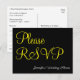 Este glamoroso diseño de tarjeta postal RSVP incluye el mensaje "Please RSVP" en la parte delantera, junto con una descripción personalizada de la ocasión. También incluye un formulario RSVP personalizado en la parte posterior para que el destinatario lo complete, junto con una dirección personalizada a la que se enviarán por correo las tarjetas RSVP completadas. Tarjetas RSVP como esta podrían ser usadas para averiguar quién asistirá a una cena fiesta, una ducha de matrimonio, un fiesta de Navidades o alguna otra celebración.