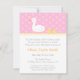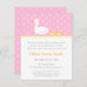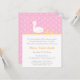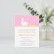 Una elegante invitación a la ducha de bebé en una paleta de colores rosa, amarillo y blanco. El diseño presenta un pato madre con sus dos pequeños patitos remando detrás de ella. El fondo rosado de los puntos de polka sugiere chicas gemelos. Personalice fácilmente los datos de su fiesta.