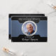 Negro y azul moderno con acentos gris plateado. El patrón de malla y metalizado cepillado hace una elección perfecta para el fiesta jubilatorio de un hombre. Sube tu foto para reemplazar la plantilla de fotos mostrada. Agregue el nombre al frente de la tarjeta y, a continuación, rellene la información del evento sobre el diseño posterior coincidente con su información.