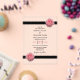 Este diseño presenta elegantes flores rosadas. Las rosas de color rosa floral, combinadas con la elegante imagen de cinta negra, crean un sofisticado y sencillo borde enmarcando la redacción. Los tonos rosas de las flores rosas contrastan con la cinta negra y la redacción crea un estilo elegante de moda. El lado inverso imita al otro lado. Elegante diseño de invitación a la boda con elementos modernos. También están disponibles artículos de papelería para bodas y otros formatos de invitación para bodas.