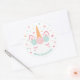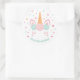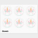 Pegatinas decorativos con el ilustracion de un oculto unicornio mágico con sólo el cuerno, las orejas, los ojos y las flores en la cabeza mostrándose entre estrellas y puntos. Perfecto para una mágica fiesta de cumpleaños de chicas con temática de unicornio! Paleta de colores de moda rosa, menta y naranja amarillo. Personalice fácilmente con su mensaje fiesta.