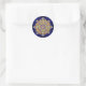 Un borde formal con motivos geométricos dorados con hojas azules y flores diminutas, arte vintage de un manuscrito antiguo. Haga clic en Personalizar para agregar su monograma, cambiar los colores de fondo, agregar texto, incluso guardar su diseño para más adelante.