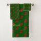 Elegante Navidades verdes toalla de baño holly puesta para usar durante la temporada festiva, con un patrón rojo holly y las palabras MERRY CHRISTMAS en tipografía de escritura dorada. El texto es PERSONALIZABLE para que pueda crear su propio texto, por ejemplo, agregar su nombre. Puede cambiar el color de fondo haciendo clic en el botón Editar este diseño y eligiendo entre la plantilla de color.