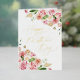 Elegante, floral tarjeta de saludo del día de la Madre con peonías de acuarela rosada, rosas, dahlias e hortensias con hojas verdes vibrantes en las esquinas del diseño. "Happy Mother's Day" (Feliz Día de la Madre) se muestra en el frente en la moderna caligrafía de Relieve metalizado dorado. El interior de la tarjeta rosa del peón Día de la Madre muestra tu foto vertical con espacio para un mensaje escrito a máquina o a mano.