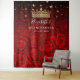 Crea tus propios telones elegantes de color rojo, negro y dorado para hacer de tu ocasión especial algo memorable y divertido. Nada dice "bienvenido" más que un gran estandarte o letrero para que tus invitados sepan que han llegado a tu evento... Ya sea una fiesta de cumpleaños de dulces 16, boda, fiesta floral mexicana, ducha de bebé o novia real, estas plantillas de tapices para telón de fondo hechas a mano pueden agregar ese brillo y glamour único que estás buscando. El tema de color vintage en esta tela de accesorio de plantilla fácil es muy popular también para una fiesta de máscaras... El diseño floral rústico ilustrado por Raphaela Wilson representa un patrón de hermosas rosas rojas, una corona de tiara dorada y confeti en forma de mariposas. Si decides editar aún más el diseño real, verás selecciones alternativas en acabado de metal falso rosa dorado y plateado. Además, puedes hacer clic en los gráficos svg y cambiarlos al color que desees, ¡incluso las flores! Con tantas opciones creativas a tu alcance, estos telones de fondo de fotos personalizados y únicos pueden coincidir perfectamente con el tema de tu fiesta. Incluso puedes cambiar la caligrafía y el estilo de tipografía moderna a fuentes que se adapten a tu estilo. ¡Disfruta! Categoría: telones de boda personalizados; telones de pared colgantes personalizados para fiestas; y tapices de telón de fondo de boda de color rojo, negro y dorado