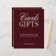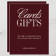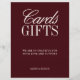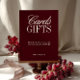 Bienvenido a sus huéspedes con este elegante cartel de tarjetas y regalos de color burdeos, perfecto para guiarlos a su mesa designada. Diseñado con un fondo de color rojo intenso y una refinada mezcla de serif y escritura tipográfica, este signo combina sofisticación con practicidad. Un detalle cuidado para bodas formales, recepciones de viñedos, celebraciones de otoño o ceremonias nocturnas, añade estilo y función a su decoración. Personalizable completo: personaliza con tus nombres, fecha de boda o texto personalizado para que se adapte a tu evento. Se coordina a la perfección con el completo paquete de papel boda "Sabrina" para un aspecto cohesivo y atemporal.