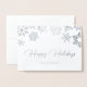 Personalizado Relieve metalizado de plata foto tarjetas de vacaciones con copo de nieve con un elegante título de letra con copos de nieve en la parte superior. Personalice fácilmente estas tarjetas de vacaciones de Relieve metalizado plateado con su imagen, nombre de familia y mensaje.