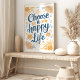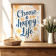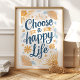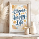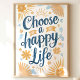 Abróchese su espacio con este alegre estampado artístico "Choose a Happy Life". El vibrante diseño acuático presenta una cita con letras a mano rodeada de alegres flores y motivos de sol, radiante positividad y optimismo. Perfecto para agregar un resplandor de sol a su sala de estar, dormitorio o oficina.