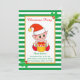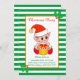 Navidades cortos, elfos vestidos de rojo en la invitación a la fiesta de Navidades de fondo de rayas verdes y blancas. Un elfo de bebé lindo sosteniendo una caja de regalo sobre fondo blanco y verde. El texto está listo para ser personalizado.