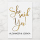Un texto moderno de escritura dorada con She Said Yes en un estilo minimalista con sus nombres personalizados debajo de una sencilla letra moderna.