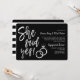 Una invitación divertida y única con letras escritas en blanco sobre negro, diseñada específicamente para su fiesta de compromiso o cena. Cuenta con las palabras "¡Ella dijo que sí!" con anillos de boda descansando al lado. En el lateral hay espacio para los detalles de su fiesta o evento único.