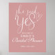 Este elegante y polvoriento guion rosado rosa "She said yes" (Sí) el signo de bienvenida a la ducha de novia puede ser personalizado con tu nombre y fecha especial. Diseñado por Thisisnotme©