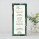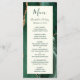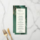 This elegant modern wedding menu features an emerald green watercolor agate frame. The customizable text combines green whimsical handwriting script with italic and copperplate fonts on an ivory background. The reverse side features a matching emerald green and gold agate design.