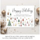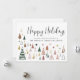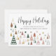 Minimalista tarjeta de vacaciones moderna para su negocio con ilustraciones abstractos retro de árboles y estrellas verdes, terracota y dorados de Navidad, "Felices Fiestas" en un guión elegante y tu saludo y nombre de compañía en una tipografía simple.