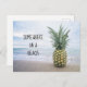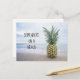 Foto de una piña sentada en la playa con tipografía preciosa.