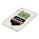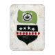 Un ilustracion de taza de café humeante en blanco y negro se sienta sobre una forma verde guisante sobre estrellas blancas y negras, grandes puntos rojos y fondo blanco texturado.