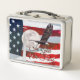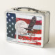 Una metalizado caja de almuerzo con la imagen de In God We Trust recopilando fotos de la Bandera Americana, un campanario de la iglesia con cruz, un águila calva voladora y la luna súper rosa llena. ¿Buscando más impresiones o productos? Siéntase libre de visitar mi tienda: http://www.zazzle.com/timelessmomentsphtgy Esta foto fue creada por Jennifer White con Timeless Moments Photography. Todas las imágenes tienen derechos de autor © Timeless Moments Photography/Jennifer White. Todos Los Derechos Reservados.