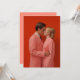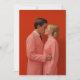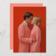 Foto minimalista de dos personas besándose con un traje rosado de fondo rojo