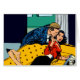 Arte de la cubierta de un cómic del vintage. A su hombre sorprende al chica bonito joven que pone en el sofá que lee una revista de la película