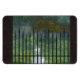 Un paisaje en 3D a principios de otoño, representando un camino que desciende por el césped hacia un bosque nublado de árboles viejos y desgarrados. Pero el camino sobrepoblado está bloqueado por una puerta de picos de hierro negro entre paredes de ladrillo oscuro. Creado en Vue.