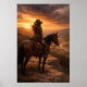 Un jinete solitario se detiene a caballo con vistas a un valle panorámico mientras la luz dorada se abre paso a través de nubes dramáticas de la tarde. Este paisaje occidental pacífico captura un momento tranquilo de reflexión y libertad en el rango abierto.