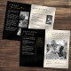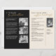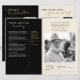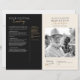 Este elegante diseño de programa conmemorativo presenta un refinado esquema de colores negro y crema con fuentes serif modernas y manuscritas, creando un homenaje sentido y digno a un ser querido. La disposición combina una tipografía reflexiva con espacio para encabezados personalizados, agradecimientos personalizados y fotos en blanco y negro, lo que lo hace ideal para una celebración de la vida o un servicio funerario. Los sutiles acentos dorados añaden un toque de sofisticación, mientras que el formato estructurado permite una presentación organizada de elogios, lecturas y actividades conmemorativas. Esta plantilla totalmente editable ofrece una hermosa manera de honrar una vida bien vivida, combinando un estilo atemporal con una personalización significativa para un recuerdo inolvidable.