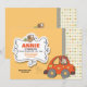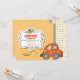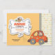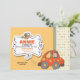 Una invitación adorable que muestra a una niña que conduce un coche y agitar. Un panel decorativo con un pájaro marrón lleva a cabo la información del fiesta.