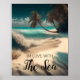 Agua turquesa y palmeras en un bloque de arte de arena blanca. Cita: "Enamorado del mar".