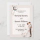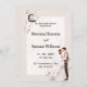 Romántica invitación al matrimonio con un encantador ilustracion de la novia y el novio. El fondo es un suave beige con delicadas hojas. El diseño es bonito y elegante, perfecto para un boda romántico.