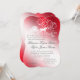Carruaje dibujado a caballo con corazones y monograma, invitación a la boda de cuento de hadas en rojo.