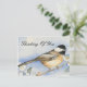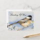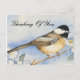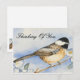 Envía un mensaje de "Pensando en Ti" con un encantador chickadee posado en hermosas flores en esta postal para amantes de las aves. Detalles realistas en negro, crema y azul se muestran a partir de mi pintura original de acuarela.