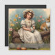 Un joven chica con un elegante vestido de época se sienta en un tronco de madera, con un bonito huevo de Pascua. Rodeada de flores florecientes y de un conejo curioso, la escena exuda calidez, nostalgia y el espíritu de Pascua.