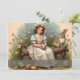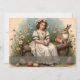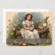 Un joven chica con un elegante vestido de época se sienta en un tronco de madera, con un bonito huevo de Pascua. Rodeada de flores florecientes y de un conejo curioso, la escena exuda calidez, nostalgia y el espíritu de Pascua.