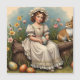Un joven chica con un elegante vestido de época se sienta en un tronco de madera, con un bonito huevo de Pascua. Rodeada de flores florecientes y de un conejo curioso, la escena exuda calidez, nostalgia y el espíritu de Pascua.