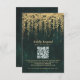 A whimsical illustration of lush hanging vines layered with gold (digital effect, not real foil!) over a sparkling emerald green watercolor background, sparkling with fairy lights and magic dust, decorates this winter spring summer fall wedding QR RSVP card with an enchanted forest theme. An elegant, modern reply card for a fairytale wedding. Perfect for brides who love the fairytale forest setting, the fairy forest or fairy garden theme and emerald green, mauve and gold.