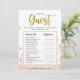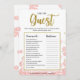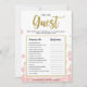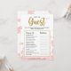 Este moderno juego floral "Encuentra al Invitado" para despedida de soltera presenta un fondo floral rosa con salpicaduras de brillo dorado. El texto está escrito en una mezcla de una fuente de caligrafía juguetona y una fuente moderna sans, esta tarjeta de Encuentra al Invitado está personalizada con el nombre de la Novia y la fecha de la Despedida de Soltera.