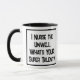 Lema gracioso en una taza que dice "Enfermo a la Enfermedad. ¿Cuál es TU súper talento?" Dos tazas para una enfermera. Texto en negrita en blanco y negro.