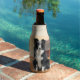 A beer or can cozy for poolside, a fun Father's Day gift for the dog dad, too. A Border Collie dog sitting in a field at the ranch with a red barn and birds in flight in the background for a great country western cowboy theme.
