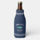 Estos refrigeradores personalizados de botellas para tu camarote, campo de pesca o viaje de pesca incluyen tu nombre familiar en un fondo azul marino, con tu año establecido y un ilustracion de pescado turquesa. La raya de los árboles que se detalla en la parte superior e inferior completa el diseño de un estilo náutico rústico.