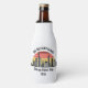 Personalized Chicago Illinois vacation bottle cooler with a silhouette of the city skyline in front of a cool sunset. Cool trip keepsake souvenir for a family trip.