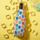 Este refrigerador de botellas tiene un diseño geométrico de cuadrados en mandarina, amapola, coral y tonos verde azulados dispersos por todo el mundo con sus contornos.