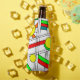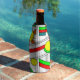 Este refrigerador de botellas tiene un diseño moderno de mediados de siglo, con un aspecto de vidrio teñido con líneas negras y círculos llenos de colores primarios y secundarios.