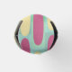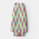 Este refrigerador de botellas tiene un diseño geométrico hecho de fondo de rectángulos de color verde-mar y azul claro con ovales amarillos y rosas encima.