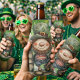 A lively St. Patrick’s Day illustration featuring a cheerful leprechaun standing between two beer barrels, surrounded by shamrocks and bright green splashes for a festive Irish feel.