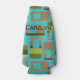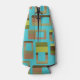 Este refrigerador de botellas tiene un diseño moderno de mediados de siglo de rectángulos redondeados en tonos verdes y marrones con agujeros en un campo de turquesa. Si te gusta el diseño pero prefieres colores diferentes, envíame un mensaje.