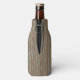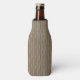 Este refrigerador de botellas tiene un diseño geométrico de una especie de ovalos de punta plana que se repiten a lo largo del diseño en azul pálido sobre un campo marrón.