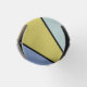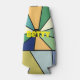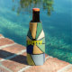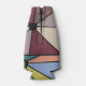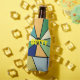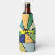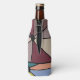 Este refrigerador de botellas tiene un diseño abstracto hecho de nueve cuadrados con un círculo y "rayos" saliendo del círculo en muchos colores diferentes.
