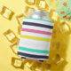 Un refrigerador de bebidas colorido con un patrón a rayas. El refrigerador es principalmente blanco con rayas horizontales en azul marino, rosa, amarillo, turquesa y azul marino. Está diseñado para adaptarse a una lata de bebidas estándar.