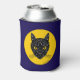 A retro-looking illustration of the face of a yellow-eyed black cat appears in a moon-like circle in this original Halloween-appropriate art by Richard H. Fay.